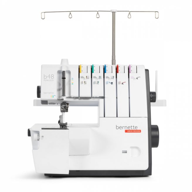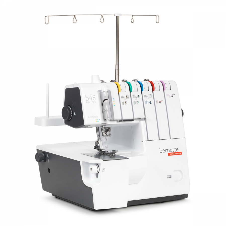 La bernette 48 FUNLOCK es el mejor modelo de la serie FUNLOCK, una combinación de máquina overlock y para puntada de cobertura. Cuenta con un total de 23 puntadas: 15 overlock, 3 de cobertura, 4 de combinación y 1 de cadeneta; de las cuales la puntada overlock tiene una anchura de hasta 7 mm, la de cobertura anchuras que van de 2,8 hasta 5,6 mm y las combinadas una anchura de hasta 10 mm. Las vías de enhebrado con código de color permiten un enhebrado más sencillo en la zona de la aguja y su enhebrador manual ayuda a enhebrar las agujas. La lanzadera inferior y la lanzadera para cadeneta llevan un enhebrador automático. La cuchilla se maneja desde abajo, lo que no solo garantiza un borde limpio de corte, sino también un manejo seguro; además puede ajustarse cómodamente con una mano. Su brillante luz LED proporciona un espacio de trabajo bien iluminado. La bernette 48 FUNLOCK tiene una velocidad de costura de hasta 1300 puntadas por minuto.