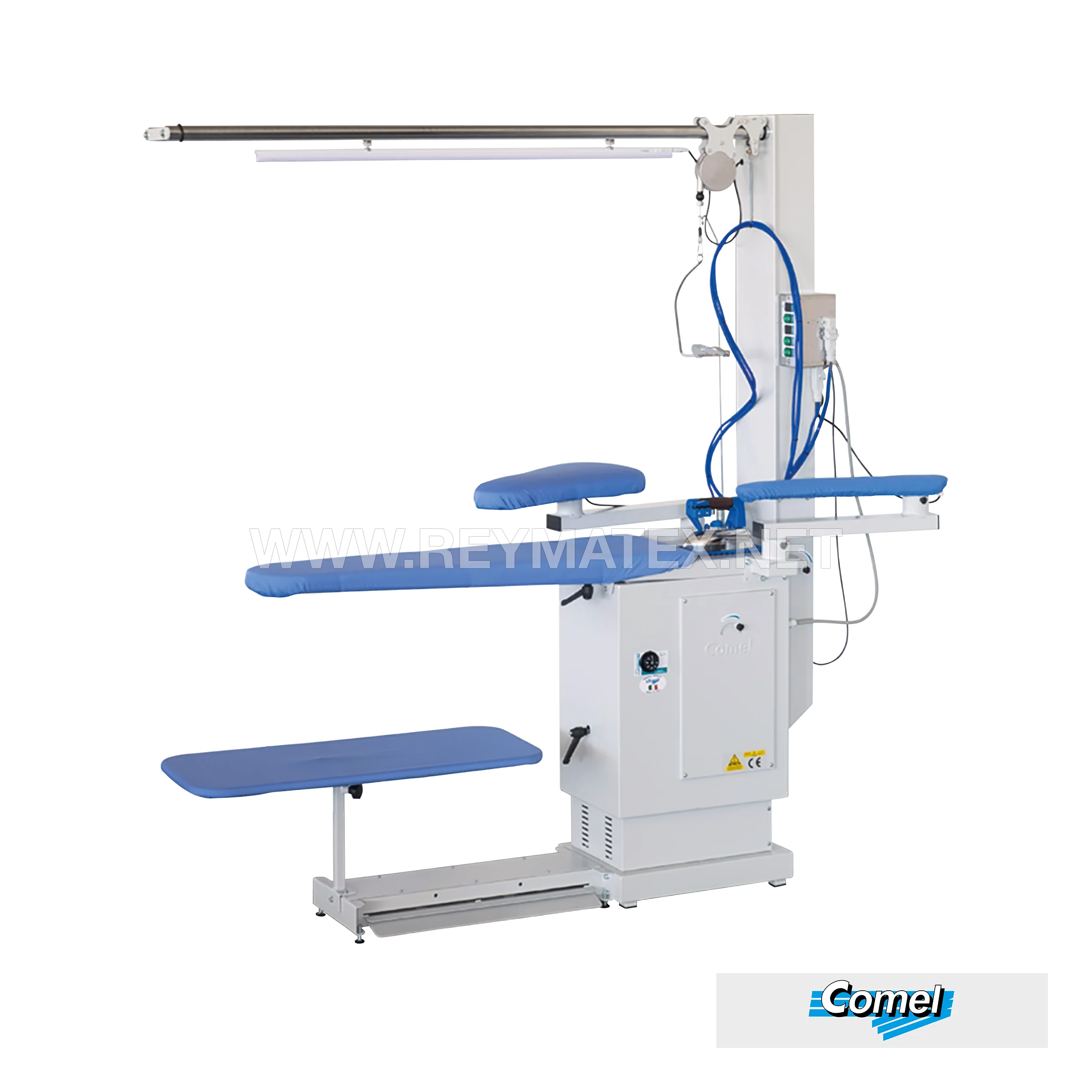 Mesa de planchar universal regulable en altura con aspiración y soplado preparada para acoplar 2 brazos. Motor 0,8 HP 220 V. Incluye soportes para 2 brazos. Completa con un brazo de planchar mangas, un brazo forma cojín, lámpara fluorescente y polipasto. Medidas del plato: 117×25-35 cm.