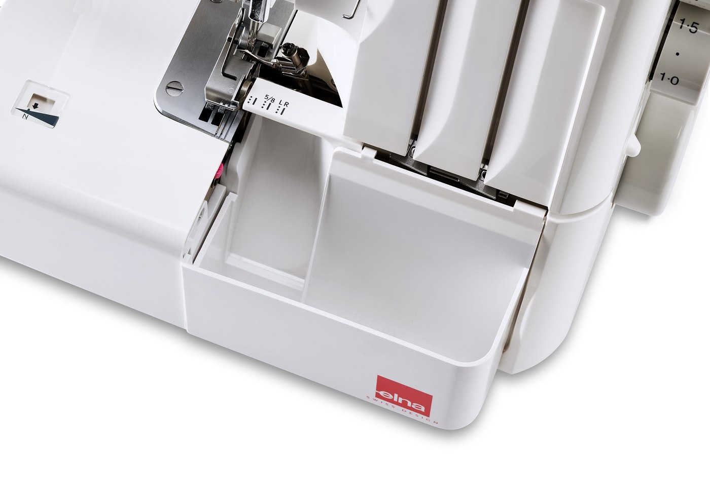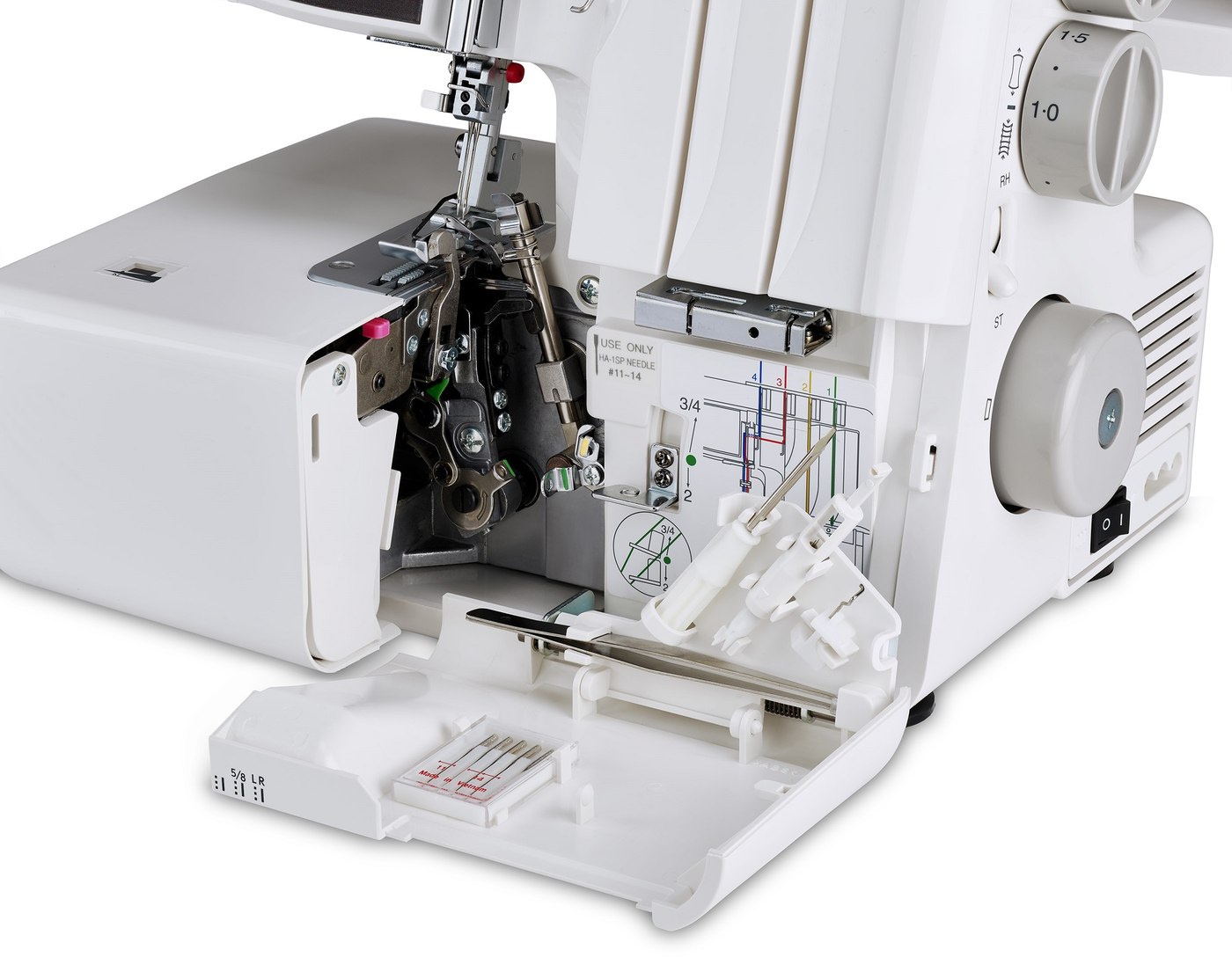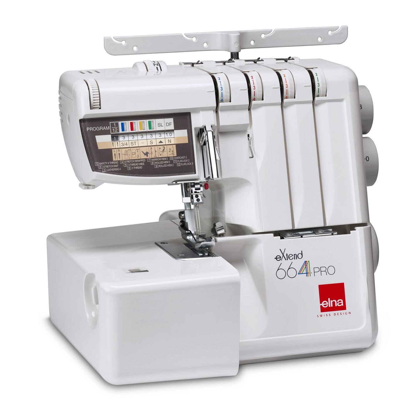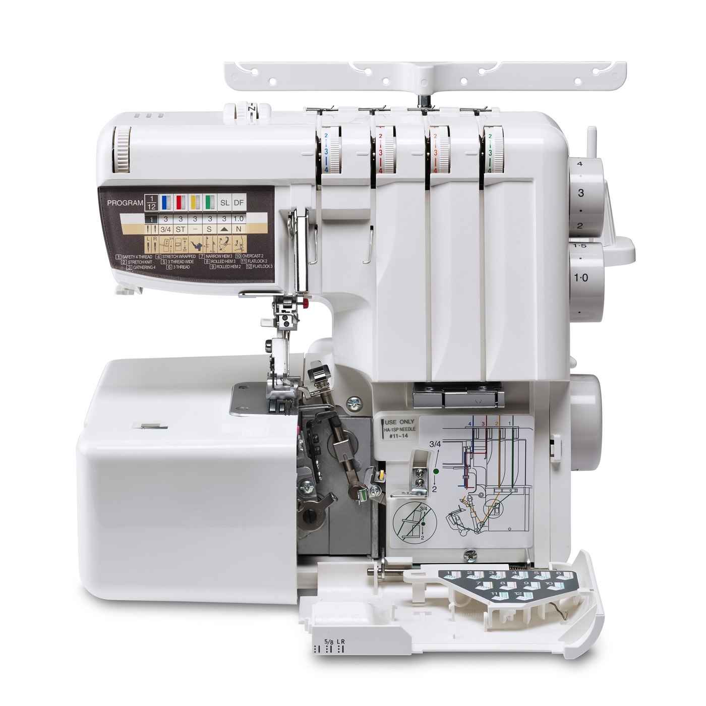 - 7 programas de puntada: para 4 hilos (puntada de seguridad, puntada de seguridad elástica y fruncido) y para 3 hilos (sobrehilado, cordoncillo estrecho y cordoncillo enrollado)
