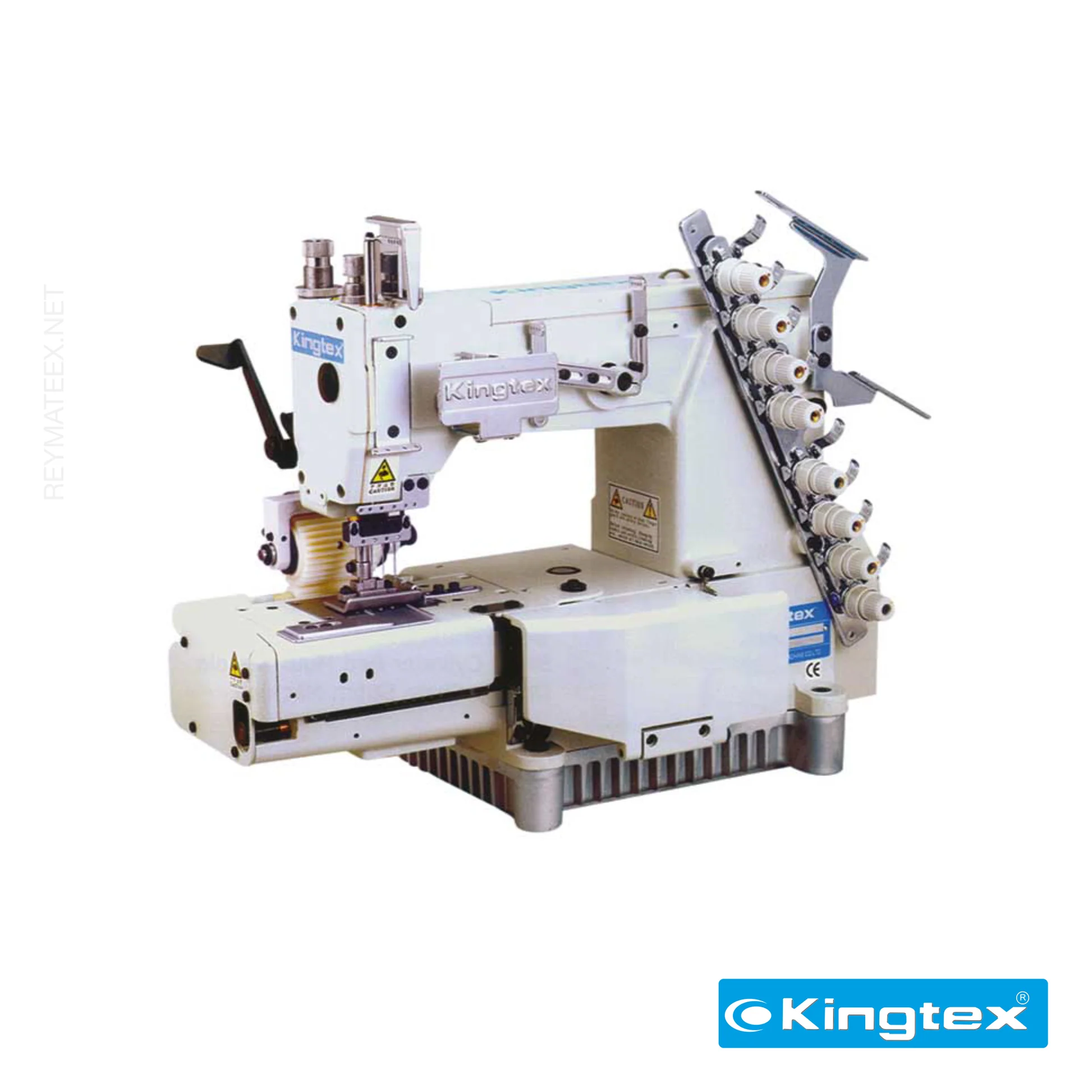 Máquina de 4 agujas doble cadeneta de base cilíndrica equipada con puller trasero de arrastre y alimentador delantero de elástico.