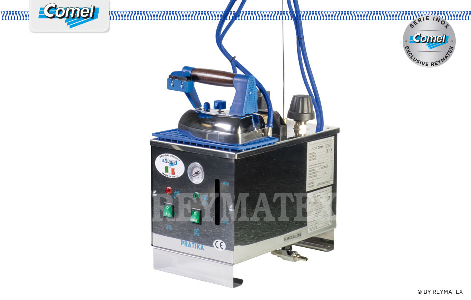 Generador de vapor con caldera de 5 litros de capacidad de acero inoxidable. Equipada con visor de nivel agua y plancha de mano industrial con mango de madera y base de silicona para la plancha. Uso semi industrial.