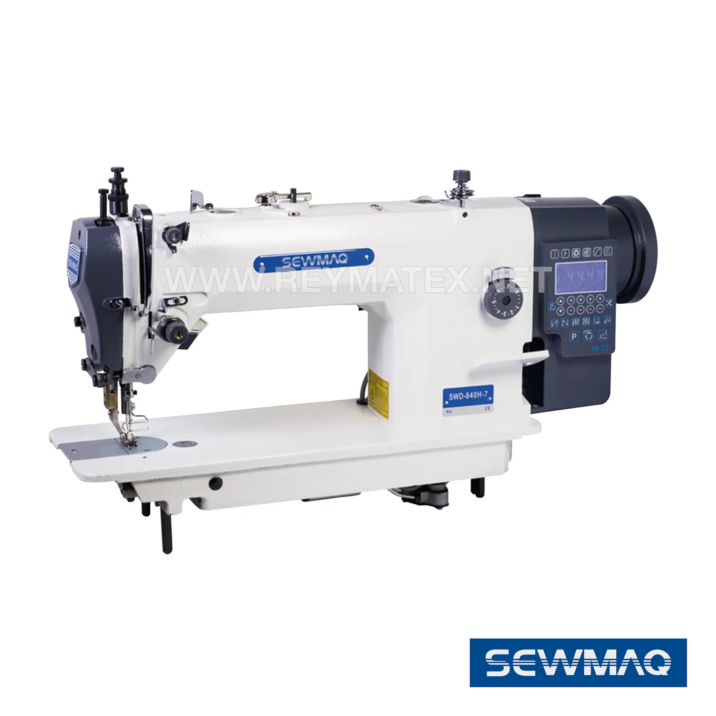 Máquina de 1 aguja de transporte por prensatelas y diente equipada con motor servo en el cabezal. Engrase automático por bomba, longitud de puntada 8 mm, velocidad máxima 2.000 PPM. Garfio vertical de gran capacidad.