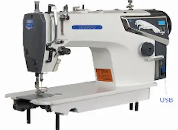 Máquina de pespunte de 1 aguja equipada con motor servo, caja de control y programador incorporados en el cabezal. Con posicionamiento de aguja, luz de LEDs y puerto USB. Para géneros medios y gruesos, longitud de puntada 6,3 mm.
