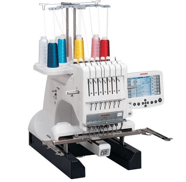 Janome MB7 Máquina de bordar semi-profesional de 7 agujas, compacta, ligera, portable quipada con cortahilos automático, 3 estilos de letras con 3 tamaños
