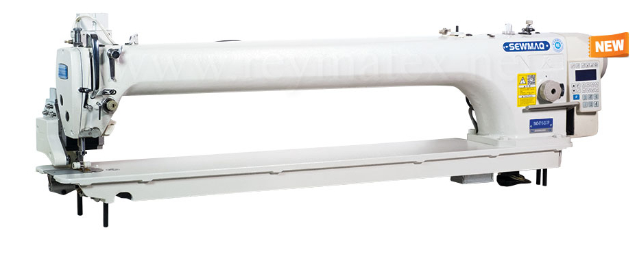 Máquina de pespunte de 1 aguja de puente largo equipada con puller electrónico trasero de arrastre. Funciones: cortahilos, atacados, retira hilos y alzaprensatelas automáticos. Motor, caja de control y panel incorporados en el cabezal. Espacio de trabajo bajo el puente 73 cm.